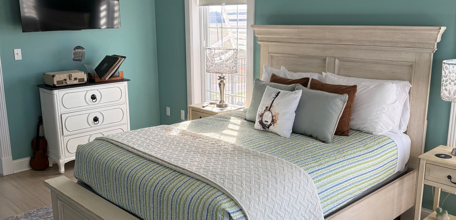 The sweet sound of string picking is what Kentucky Bluegrass music is known for. This room comes complete with a luxurious Queen bed with premium linens, flatscreen TV, Record player with a wide variety of music choices, sitting area, jacuzzi tub and direct private access to our expansive front porch.
